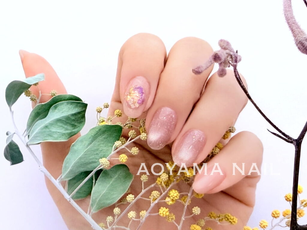 シアーピンクベージュのマグネットネイルに押し花ドームデザイン☆